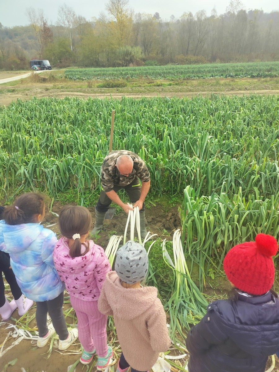 Le attività sono iniziate in aula con Margherita Testa, referente del progetto per il Consorzio, dove gli alunni hanno conosciuto la storia del porro, le fasi di coltivazione e di trasformazione e la lunga tradizione che lo lega a Cervere. Poi il percorso si è spostato sul territorio: giovedì 13 novembre le classi quarte e quinte hanno visitato a Roreto di Cherasco l’azienda Ferrari Specialità Alimentari, socia trasformatrice del Consorzio, osservando dal vivo la lavorazione del porro per la creazione dei tajarin e scoprendo come anche le foglie verdi, solitamente scartate, possano diventare preziosi ingredienti. Venerdì 14 novembre le prime, seconde e terze sono state accompagnate nella Valle dei Porri, dove il socio produttore Bartolomeo Scarzello ha mostrato loro come si raccoglie e pulisce un porro, come si confeziona un mazzo e come si applica il marchio del Consorzio.