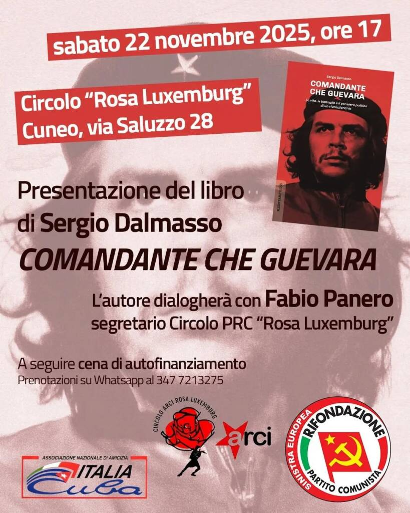 Sabato 22 novembre 2025, alle ore 17, presso il Circolo “Rosa Luxemburg” di Cuneo, in via Saluzzo 28, Sergio Dalmasso presenterà il suo nuovo libro "Comandante Che Guevara. La vita, le battaglie e il pensiero politico di un rivoluzionario". L’autore dialogherà con Fabio Panero, segretario del Circolo PRC “Rosa Luxemburg”. L’incontro è promosso da Rifondazione Comunista, dal Circolo ARCI Rosa Luxemburg e dall’Associazione Nazionale di Amicizia Italia-Cuba.