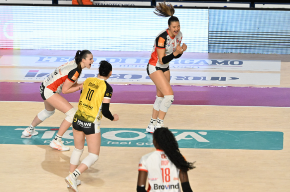 Dentro Allaoui, Koulisiani e Marring e copione simile nel secondo parziale, con allungo delle Gatte 5-8. Bergamo conquista un break e pareggia, 9-9. Torna l’equilibrio, nessuna squadra riesce a prendere vantaggio. Le formazioni impattano sul 20 pari, poi Bergamo cambia marcia: 3 muri delle bergamasche e una super Kipp portano le padrone di casa sul 24-20. Le Gatte rosicchiano due punti, poi il servizio out di Marring chiude il set 25-22.