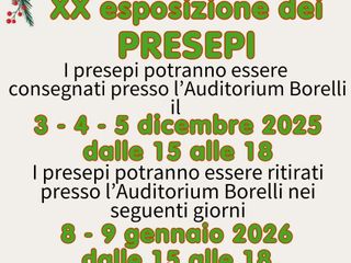 Per chi volesse partecipare realizzando un presepe da esporre potrà consegnarlo nei giorni 3-4-5 dicembre dalle ore 15 alle 18 direttamente all’auditorium 'Borelli'.