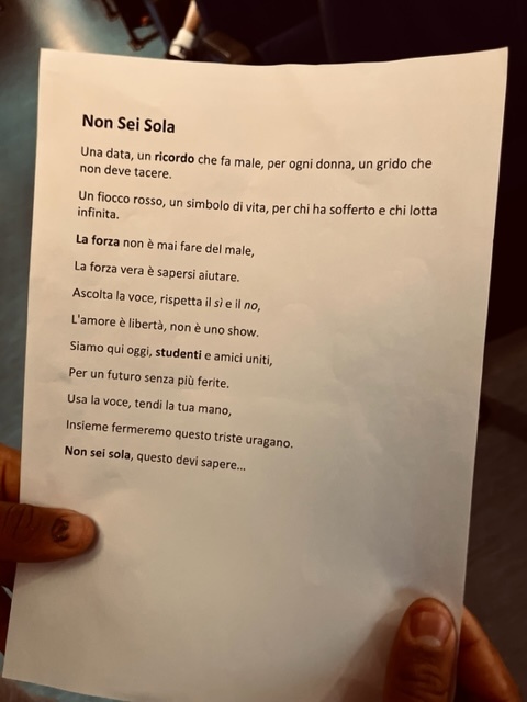 “Oggi, 25 novembre, è la Giornata Internazionale contro la violenza sulle donne. Ma non siamo qui per fare una lezione sulla violenza. Siamo qui per parlare di futuro, di rispetto e di responsabilità che ognuno di noi ha.”