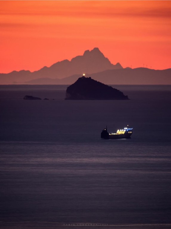 L'immagine, pubblicata ieri sera, giovedì 27 novembre sul profilo Instagram del fotografo, è stata scattata da Pedona (LU), ad una distanza di 22.6 km dalla nave cargo Rosa dei Venti, 37.7 km dall’isola del Tino in primo piano e 269 km dal Re di Pietra, come spiega Longaron nel post, confermandosi ancora una volta prodigio del calcolo e della vista.