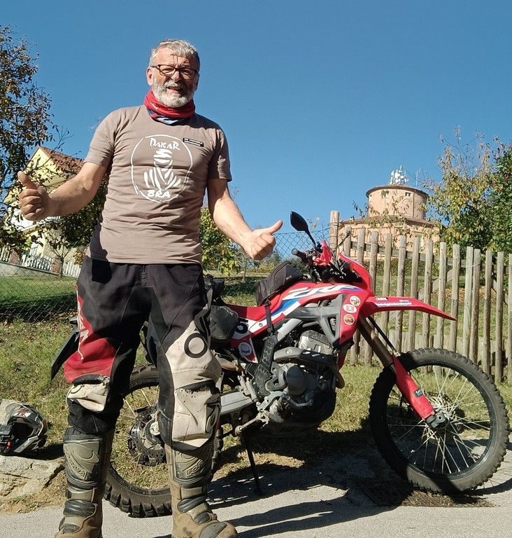 Dopo l’esperienza del 2024, che mi ha visto impegnato in un viaggio in Tunisia per 17 giorni sempre in solitaria, ho maturato il desiderio di un viaggio più impegnativo: fare la Cherasco-Dakar. Da braidese mi piaceva però l’idea che il ritorno si chiamasse Dakar-Bra. Perciò, il 27 settembre di quest’anno sono partito con una moto 300 di cilindrata.