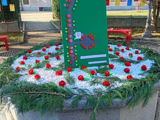 Per l’occasione gli alunni hanno anche realizzato una piccola installazione: una fontana adornata con rose rosse preparate dagli stessi scolari, a completamento di un momento partecipato e carico di significato.