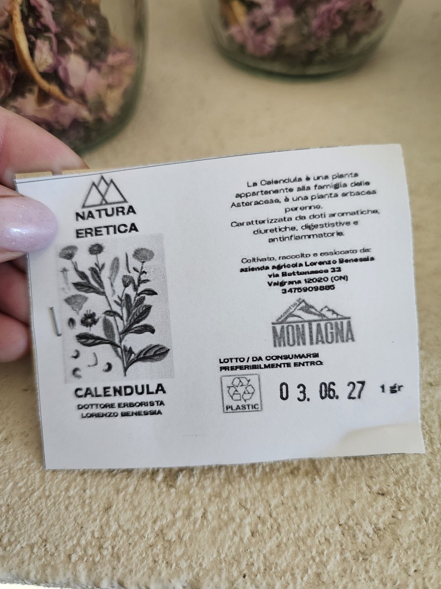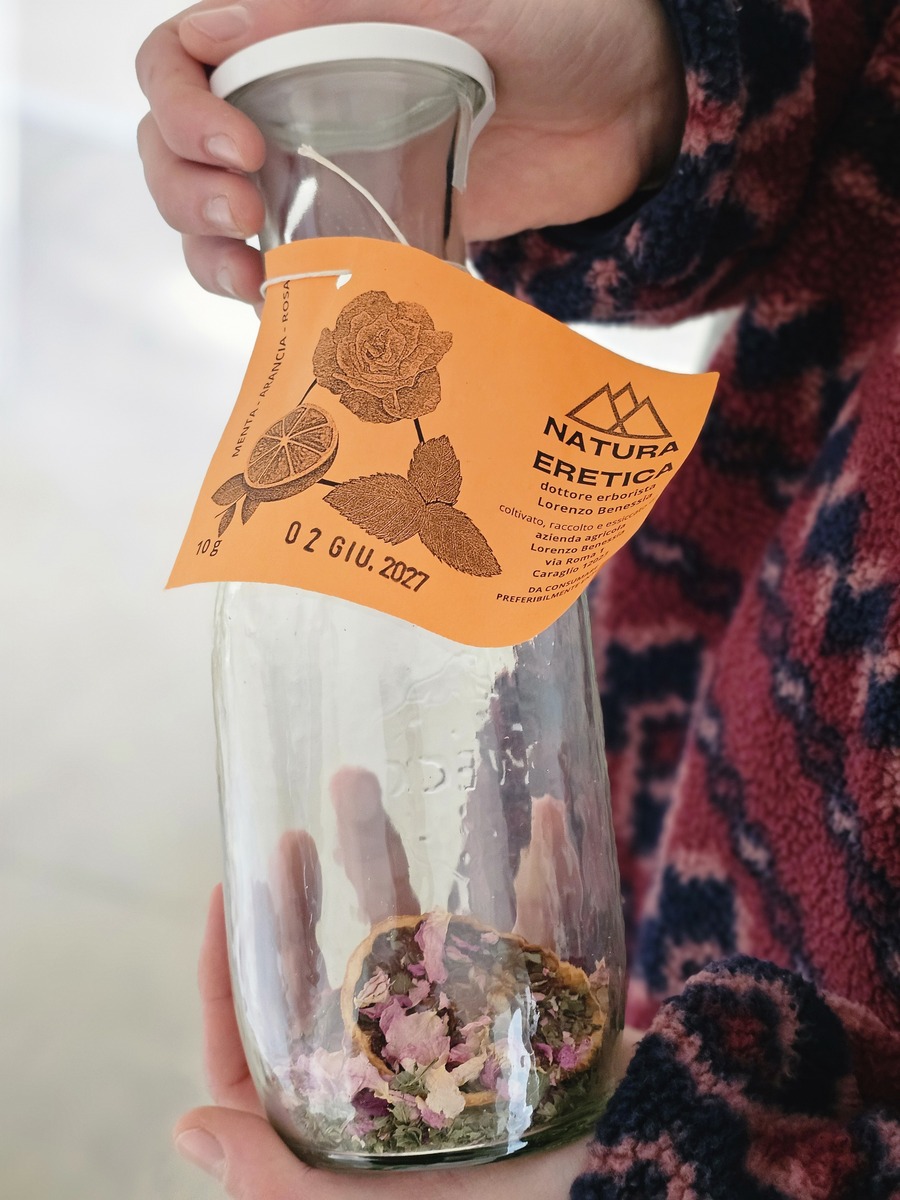 In un angolo del laboratorio, che con orgoglio Lorenzo mi fa visitare, ci sono anche altri prodotti: sali aromatici, preparati per tisane e piccole bustine monodose per due tazze. Ogni bustina è un concentrato di campo: fiori interi di calendula, fiordaliso, petali e foglie ancora vivi nel colore, essiccati lentamente a freddo, tra i 32 e i 36 gradi, per conservare intatti profumo e principi attivi.