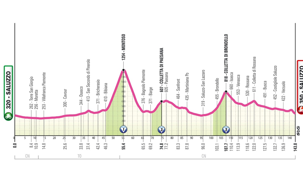 143 km con partenza ed arrivo nella capitale del marchesato durante i quali verranno affrontati tre GPM: Montoso, Colletta di Paesana e Colletta di Brondello.