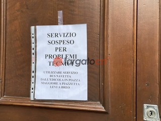 Alla stazione di monte l'ingresso è chiuso ed è segnalata la problematica con un cartello che indica il servizio sostitutivo da Piazza. Il bus navetta passerà di fronte all'edicola in piazza Maggiore e arriverà a Breo in piazzetta Levi.