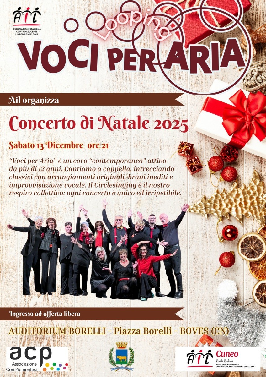 Sabato 13 dicembre alle ore 21, all’auditorium Borelli di Boves, si terrà il Concerto di Natale “Voci per Aria”. Un concerto solidale per raccogliere fondi a favore dell’Ail, l’associazione italiana contro le leucemie.