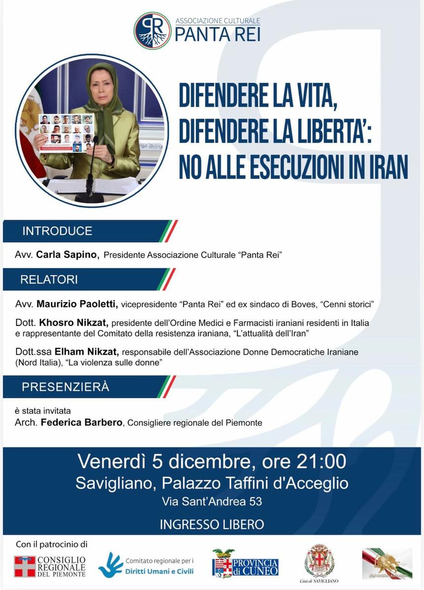 Venerdì 5 dicembre alle ore 21, a Savigliano, presso Palazzo Taffini d’Acceglio, via Sant’Andrea 53, l’associazione Culturale Panta Rei ha organizzato un evento dal titolo “Difendere la vita, difendere la libertà: no alle esecuzioni in Iran”.