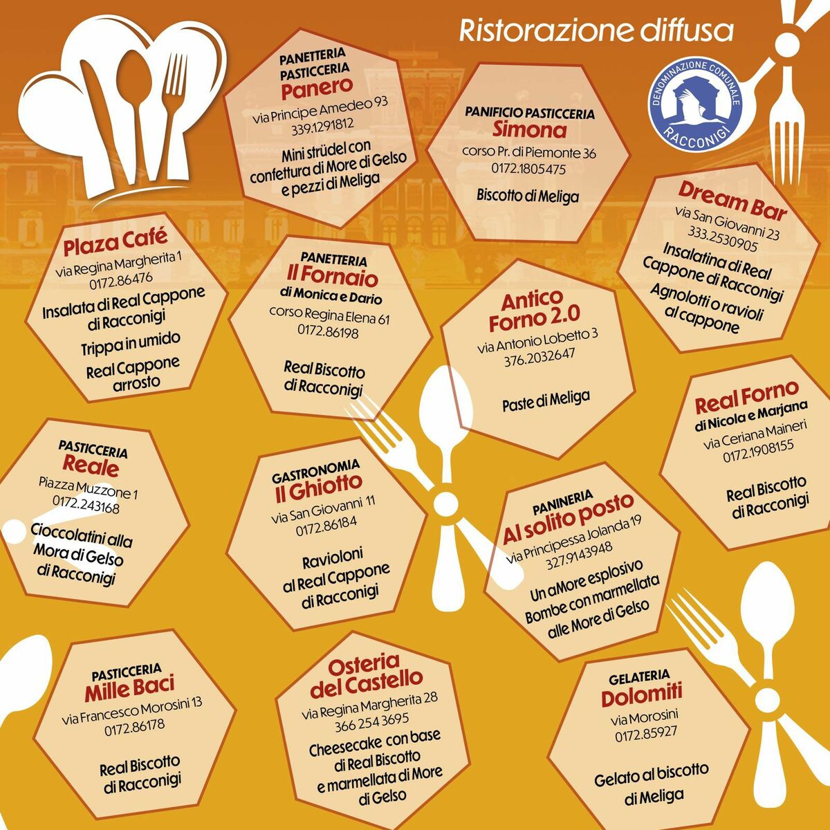 Anche quest’anno, in occasione della Fiera, torna la ristorazione diffusa: le attività del territorio offriranno piatti a base di Real Cappone, trippa e altri prodotti De.Co. del territorio come la mora di gelso e il Real Biscotto di Racconigi.