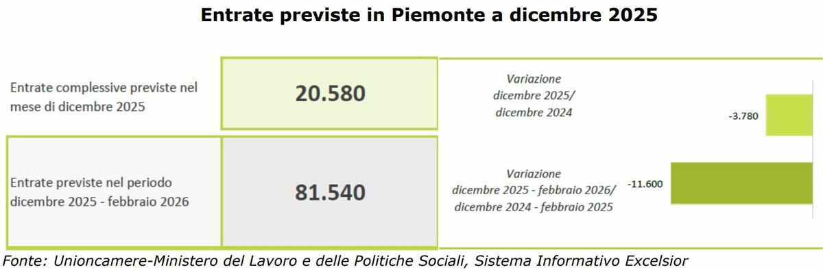 Sono circa 20.580 i contratti programmati dalle imprese piemontesi per dicembre 2025, valore che sale a 81.540 considerando l'intero trimestre dicembre 2025 – febbraio 2026.