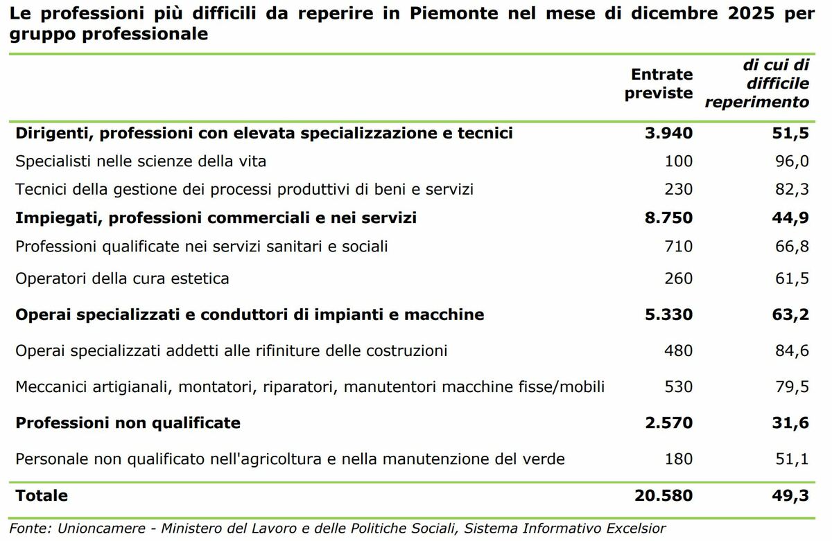 A dicembre 2025 sarà difficile da reperire il 49,3% delle figure professionali da inserire nelle aziende piemontesi, principalmente a causa della mancanza di candidati idonei a ricoprire le posizioni vacanti nel 31,9% dei casi, mentre nel 13,2% la ragione è da ricercare nell'inadeguata preparazione degli stessi.