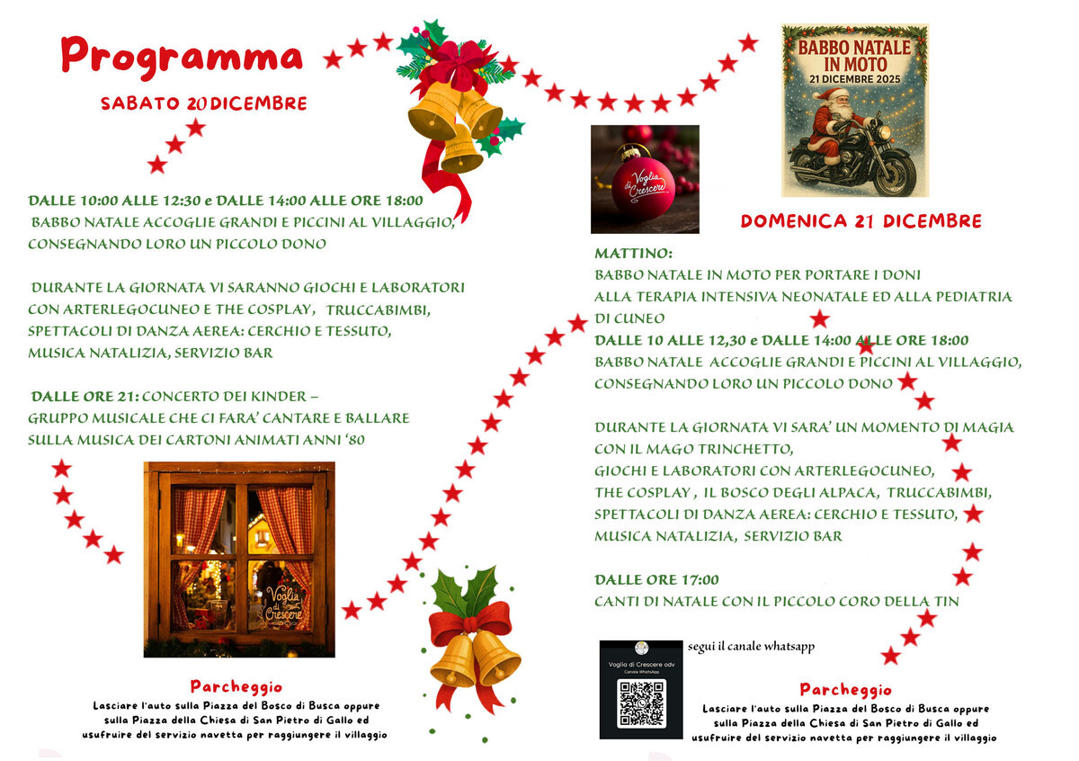 La domenica si aprirà con un momento speciale: Babbo Natale in moto, che porterà i doni direttamente ai reparti dell’Ospedale di Cuneo. Un gesto che ogni anno lascia il segno. A seguire, il villaggio riaprirà al pubblico e il clima di festa continuerà tra magie del Mago Trinchetto che saprà stupire grandi e piccini, giochi e laboratori con AlterLego Cuneo, il Bosco degli Alpaca, danza aerea, musica e tante attività pensate per sorprendere e coinvolgere i bambini.