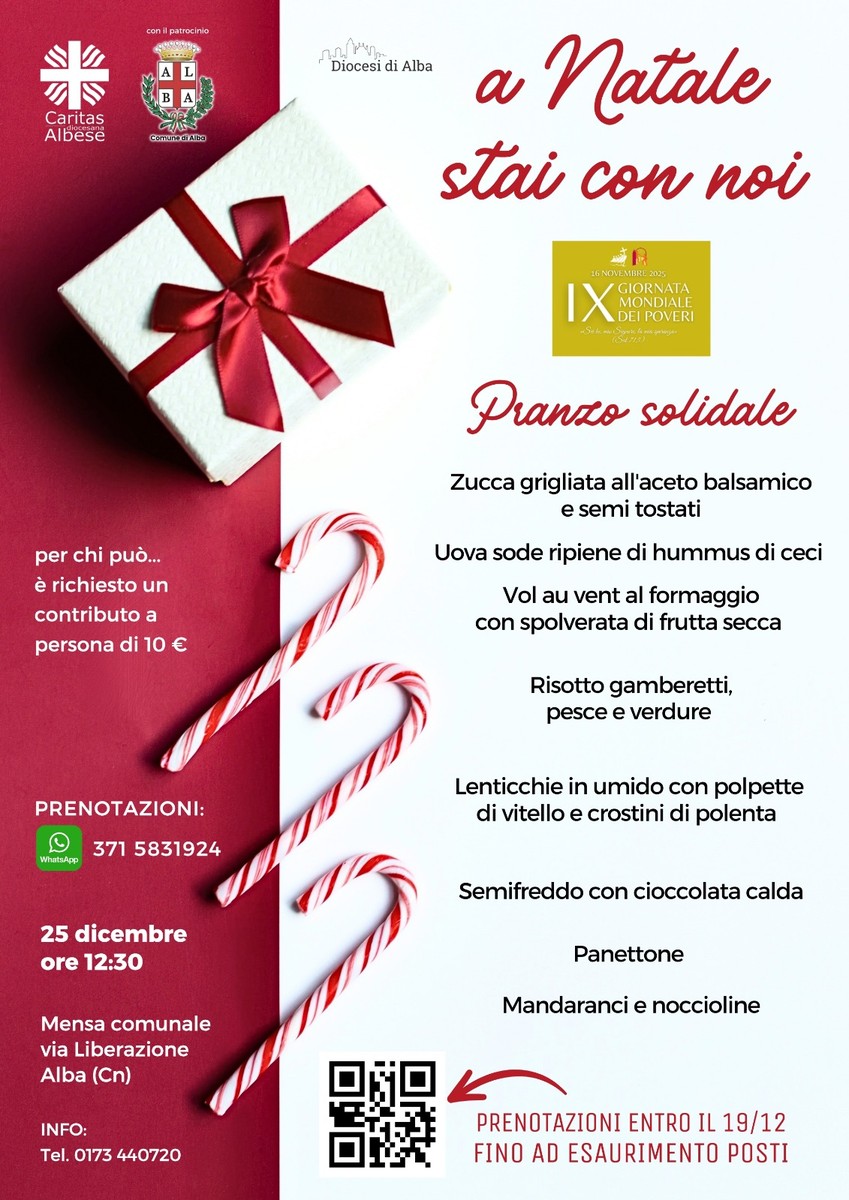 La Caritas diocesana ha scelto di trasformare il giorno di Natale in un gesto concreto di vicinanza. Giovedì 25 dicembre alle ore 12.30, presso la mensa comunale di via Liberazione, si terrà un pranzo solidale rivolto alle persone che abitualmente frequentano la mensa, agli anziani e a quanti vivono situazioni di solitudine o fragilità. L’iniziativa ha il patrocinio della Città di Alba.