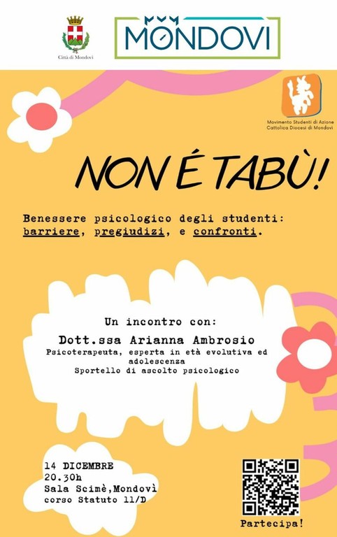 Domenica 14 dicembre, alle 20.30, il Movimento Studenti di Azione Cattolica di Mondovì è lieto di presentare la prima serata dal titolo “Non è Tabù”.