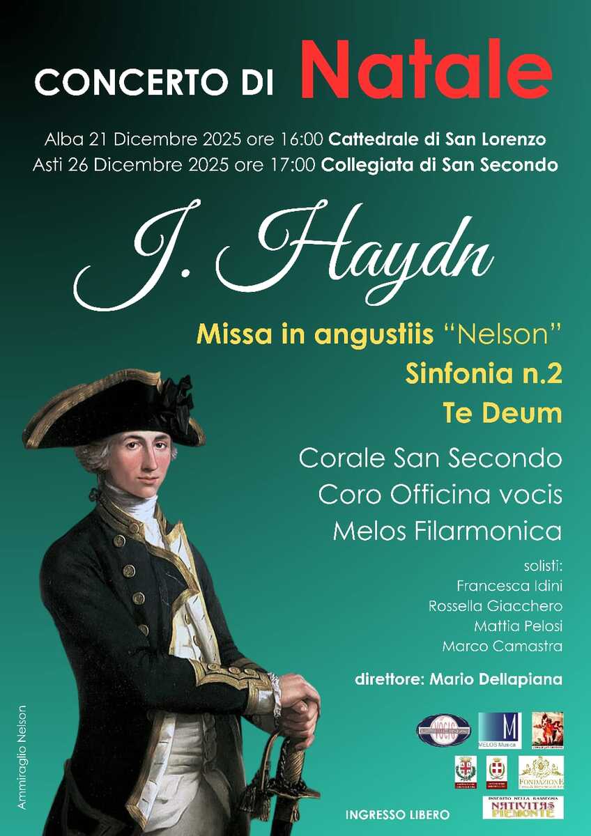 Il 21dicembre 2025 alle ore 16 ad Alba, nella Cattedrale di San Lorenzo, si terrà il Concerto di Natale organizzato dalle Corali San Secondo di Asti e Officina vocis di Neive, accompagnate dall’Orchestra Melos Filarmonica di Torino e dirette dal Maestro Mario Dellapiana. Le voci soliste saranno quelle di Francesca Idini (soprano), Mattia Pelosi (tenore), Rossella Giacchero (contralto), Marco Camastra (basso).