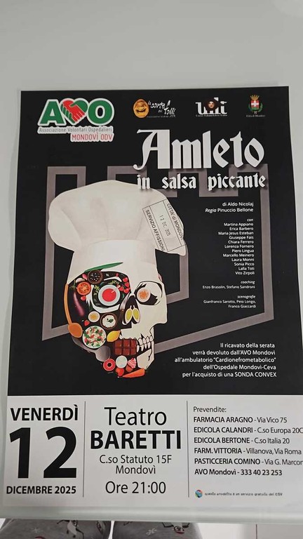 Venerdì 12 dicembre il Teatro Baretti di Mondovì ospiterà “Amleto in salsa piccante”, brillante commedia di Aldo Nicolaj diretta da Pinuccio Bellone, con la Compagnia Teatrale “La corte dei Folli”.
