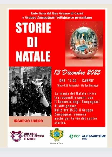 Alle 17, sempre sabato 13, grande attesa per gli zampognari di Vottignasco, che al Teatro Vacchetti creeranno la magia del Natale, tra racconti e suoni. Prima dello spettacolo, alle 15.30, si esibiranno per le vie di Carrù.