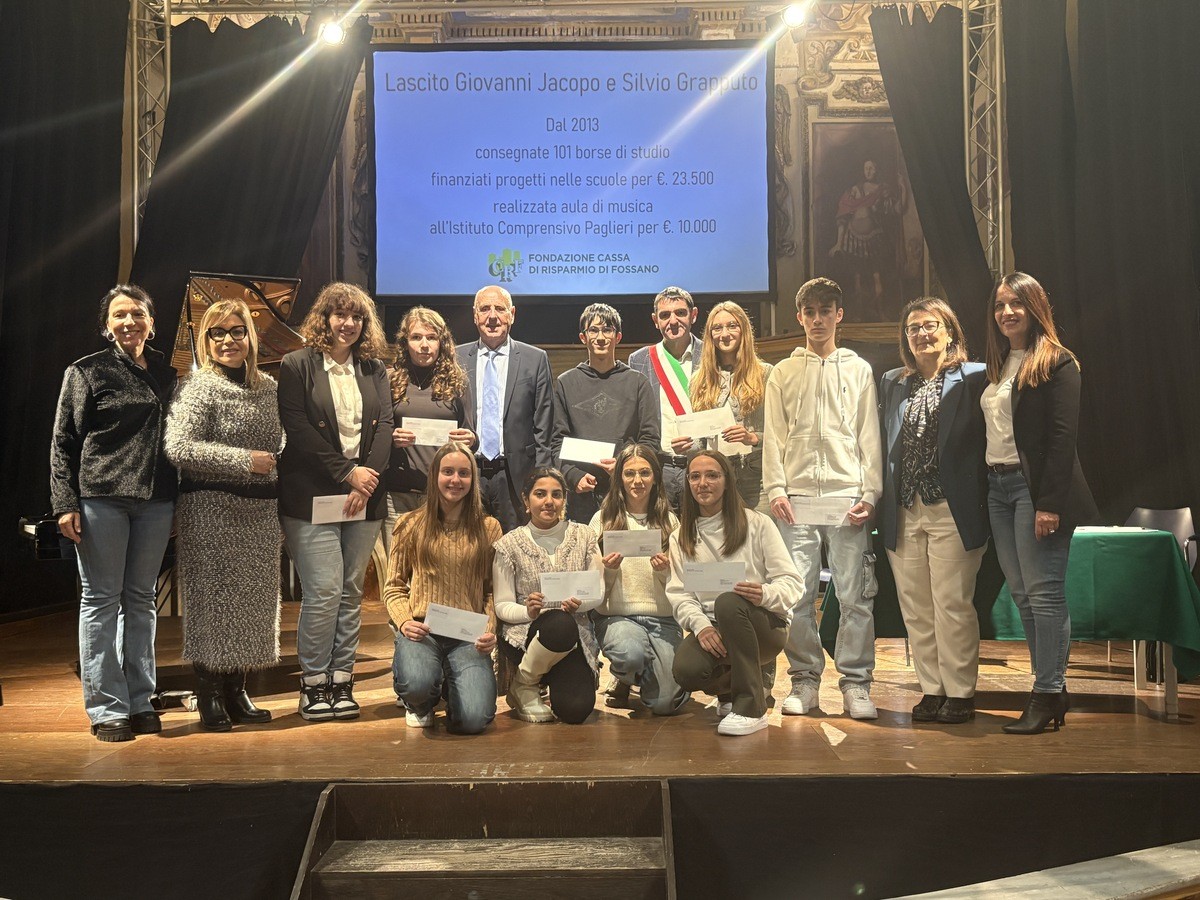 Si è svolta la tradizionale cerimonia di consegna delle borse di studio finanziate dalla Fondazione Cassa di Risparmio di Fossano attraverso i lasciti delle famiglie Favole e Grapputo. Oltre al presidente Giancarlo Fruttero e al segretario generale Monica Ferrero, era presente anche il sindaco Dario Tallone.