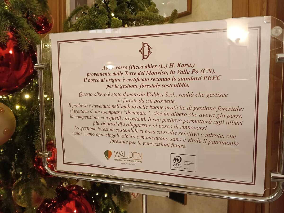 È un cimale di abete, proveniente dal diradamento di un bosco certificato Pefc (Programma per il riconoscimento degli schemi di certificazione forestale) situato a Pian Munè di Paesana, in Valle Po, ad accogliere simbolicamente le festività nella sede della Camera dei Deputati.