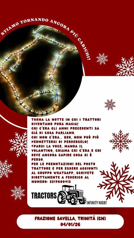 Le feste non sono ancora iniziate, ma a Trinità i motori sono già accesi per la nuova edizione della Tractors Infinity Night alla Savella che, lo scorso anno, aveva dato vita a un cappello della Befana con 214 trattori (leggi qui).
