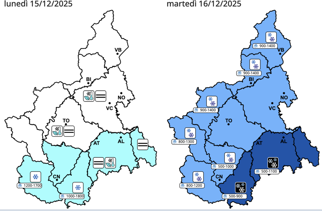 In attesa di maggiori dettagli nel consueto bollettino di Datameteo di inizio settimana, oltre che della probabile allerta diramata da Arpa Piemonte nel bollettino atteso per la giornata di domani, emergono già numerosi dati in vista di martedì 15 dicembre, con abbondanti precipitazioni nevose attese soprattutto nella zona sud del Piemonte.