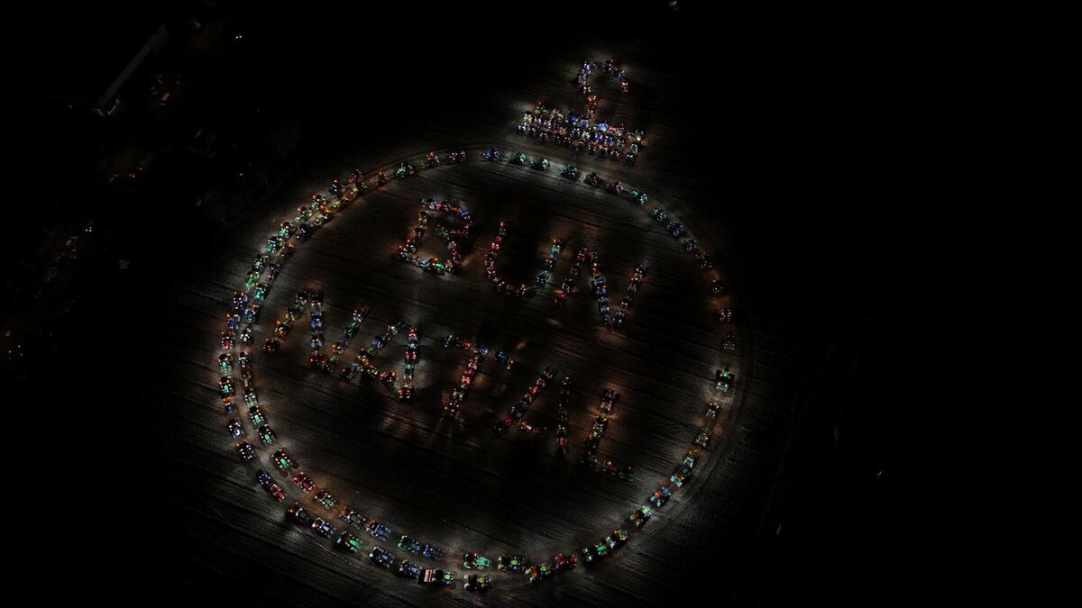 Con un giorno di anticipo, causa allerta neve prevista per domani, nel tardo pomeriggio nell'area industriale si sono radunati oltre 200 trattori che hanno dato vita a una grande pallina di Natale che al centro recita "Bun Natal".