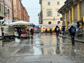 Anche nel capoluogo si registra neve mista a pioggia. Nessun particolare criticità sul fronte della viabilità, mentre l’affollato appuntamento mercatale del martedì fa registrare presenze ridotte a partire da quelle degli ambulanti.