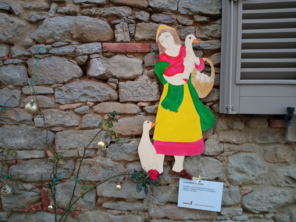 Da questo intreccio di mani e idee è nato il "Presepe di Bossolasco", allestito nel cuore del borgo, in via Umberto I, tra le rose in riposo invernale, e visitabile fino a gennaio. Lungo il percorso si incontrano figure in legno che raccontano la vita rurale di un tempo e i personaggi della tradizione piemontese: Gelindo con Alinda e la figlia Aurelia, il pastorello dormiente Benino, ma anche il panettiere, il vinaio, la venditrice di castagne, il pescivendolo, l'Ancioè (venditore di acciughe) e il venditore d'aglio, tutti ritratti nel gesto del loro mestiere quotidiano.