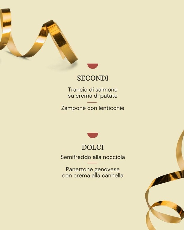 Dolce finale e brindisi di mezzanotteA chiudere il menù di San Silvestro da Trepiasì arriva una dolce coccola: semifreddo alla nocciola accompagnato dal classico panettone genovese, servito con una profumata crema alla cannella.