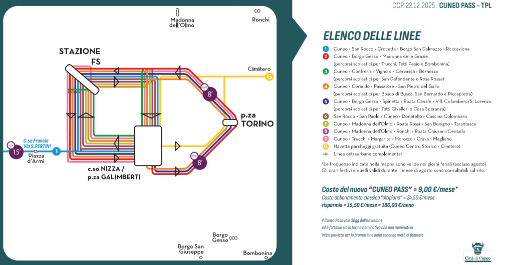Al via dalla seconda metà febbraio “Cuneo pass”, il nuovo incentivo del Comune di Cuneo per l'uso preferenziale del trasporto pubblico locale riducendo così il traffico veicolare sull'altipiano.