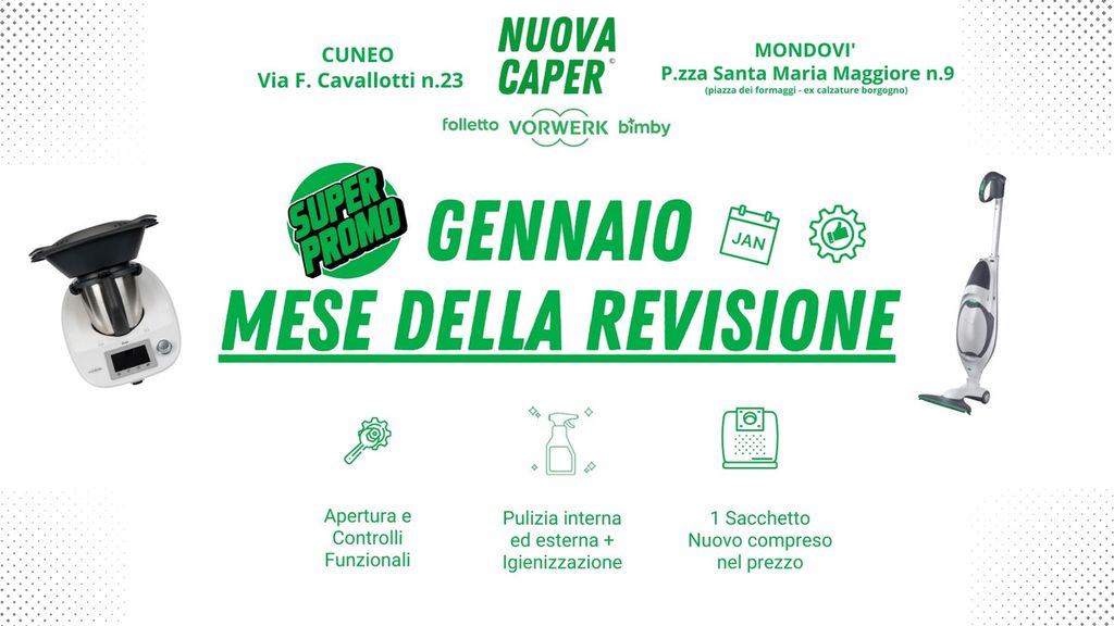 Con l’inizio del nuovo anno torna la voglia di ordine, efficienza e buone abitudini. E quale occasione migliore di gennaio per prendersi cura dei propri elettrodomestici? Per tutto il mese, i Centri Assistenza Autorizzati Vorwerk di Cuneo e Mondovì lanciano una promozione pensata per chi desidera prestazioni elevate e tranquillità nel tempo.