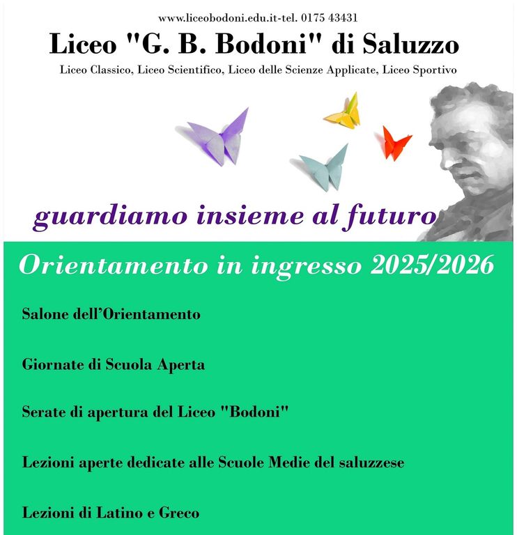 Per ulteriori informazioni, news e consultazione del PTOF (piano triennale dell’offerta formativa) si invita ad accedere al sito della scuola (www.liceobodoni.edu.it), dove è anche possibile reperire articoli relativi all’Orientamento nel numero dello scorso ottobre del periodico online, “Il Bodoni a caratteri mobili” ("Il Bodoni a caratteri mobili" - Il nostro giornale | LICEO "G.B. BODONI" DI SALUZZO); tale numero è stato infatti interamente dedicato alla presentazione dei quattro indirizzi, arricchita dalla testimonianza diretta di docenti, studenti frequentanti ed ex-allievi che, ultimati i cinque anni al Liceo, si sono appena affacciati al mondo universitario.