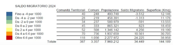 I risultati emersi dal Rapporto Montagne Italia 2025, prodotto da Uncem, hanno sorpreso rispetto ad alcuni dati sull'andamento demografico dei territori, che parlano di un "neopopolamento" delle zone montane, con un saldo migratorio del 10 per mille in Italia tra il 2019 e il 2023, che inverte una tendenza definibile in "spopolamento". La "carica dei 100mila" l'ha chiamata Uncem. Che poi migliora con i dati 2024 [tabella di seguito, +34.500 residenti]. Eccoli a questo link: https://uncem.it/montagna-attrae-i-nuovi-dati-uncem-del-rapporto-montagne-italia-nel-2024-alpi-e-appennini-fanno-meglio-del-quinquennio-2019-2023/