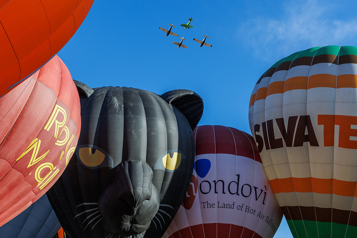 [Il sorvolo dei quattro aerei dell'Aero Club Torino sopra le mongolfiere di Mondovì - fotografia di Samuele Silva]