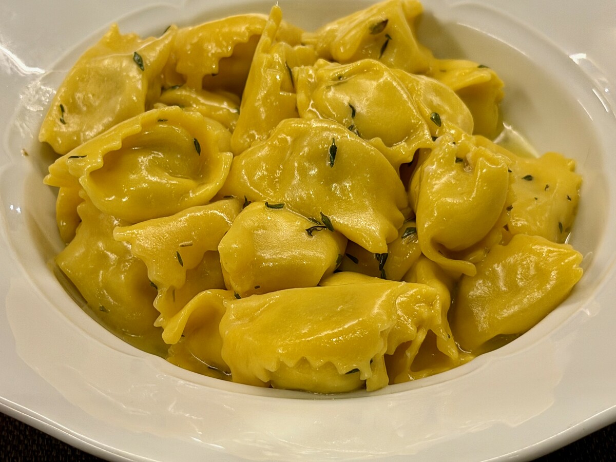 Essenziali invece, ma questa volta in linea con l’identità del piatto, i Plin di cappone di Morozzo, il cui ripieno viene valorizzato dall’equilibrato profumo di burro e timo;