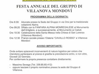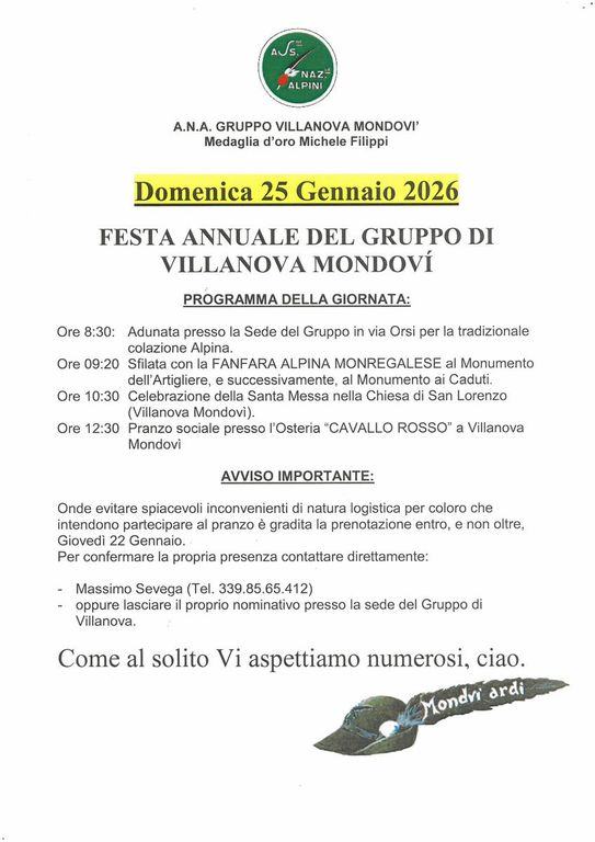 Un momento particolarmente sentito sarà inoltre la Festa annuale del Gruppo Alpini di Villanova Mondovì, intitolato alla Medaglia d’Oro Michele Filippi, in programma domenica 25 gennaio.