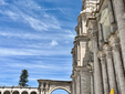 Ma è solo avvicinandosi al centro che la città rivela la sua vera natura.La pietra chiara del “Sillar” domina lo sguardo. Riflette la luce con una forza quasi abbagliante, disegna volumi netti, contorni precisi. È da qui che nasce il soprannome di “Ciudad Blanca”, ma ridurre Arequipa a una questione cromatica sarebbe un errore. Il bianco non è solo estetica. Questa è una città costruita ai piedi dei vulcani, su una terra instabile, e lo ricorda in ogni dettaglio. Nulla è leggero, nulla è solo bello. Nel centro storico, tutto cambia passo. Il rumore si attenua, le strade si fanno più ordinate, come se il luogo imponesse spontaneamente una disciplina. Nella Plaza de Armas, ogni dettaglio trova una misura. I porticati, le arcate, la facciata della Catedral: sono elementi al posto giusto, senza ostentazione. Di sera, l’ambiente si trasforma. Le luci calde scolpiscono la pietra, l’acqua delle fontane riflette le torri come se volesse trattenerle. Arequipa non cerca l’effetto immediato. Si lascia scoprire attraverso i dettagli: i portali barocchi consumati dal tempo, le finestre incorniciate da secoli di sole, i bassorilievi che raccontano una fede concreta.