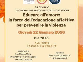 Il Lions Club Fossano e provincia Granda in collaborazione con Noi 4 You, ed in occasione della giornata internazionale dell’educazione apre l’anno con un evento rivolto alla Comunità per riflettere sul significato e sul ruolo dell’educazione affettiva come strumento per prevenire ogni forma di violenza.