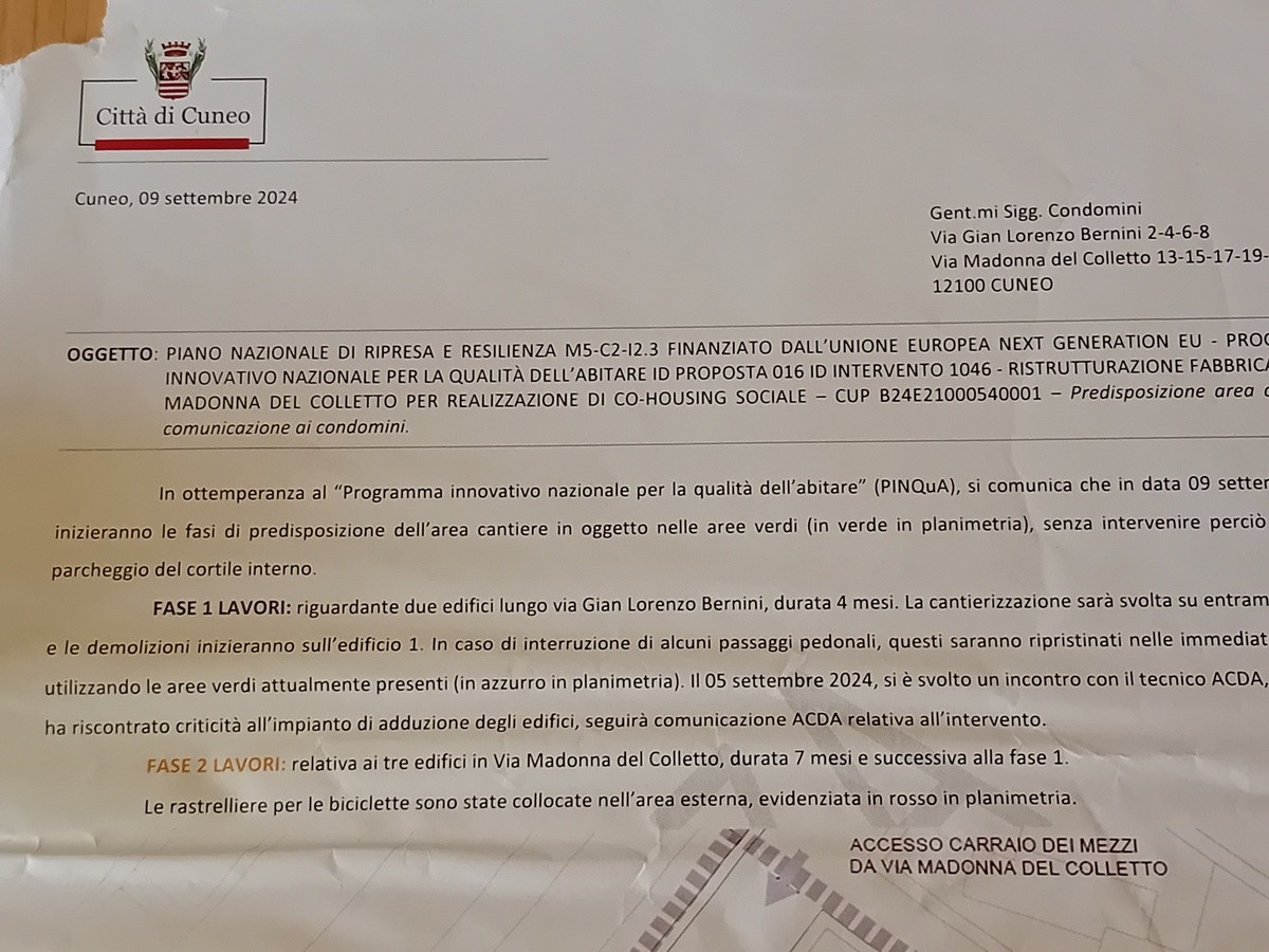 Riceviamo e pubblichiamo le considerazioni dei residenti dei civici 6 e 8 di Via Gian Lorenzo Bernini a Cuneo in "ostaggio" da agosto 2024 dei cantieri di realizzazione del progetto Pinqua, non oggetto di discussione. La lettera conclude con la richiesta dell'apertura di un varco provvisorio per limitare i disagi.