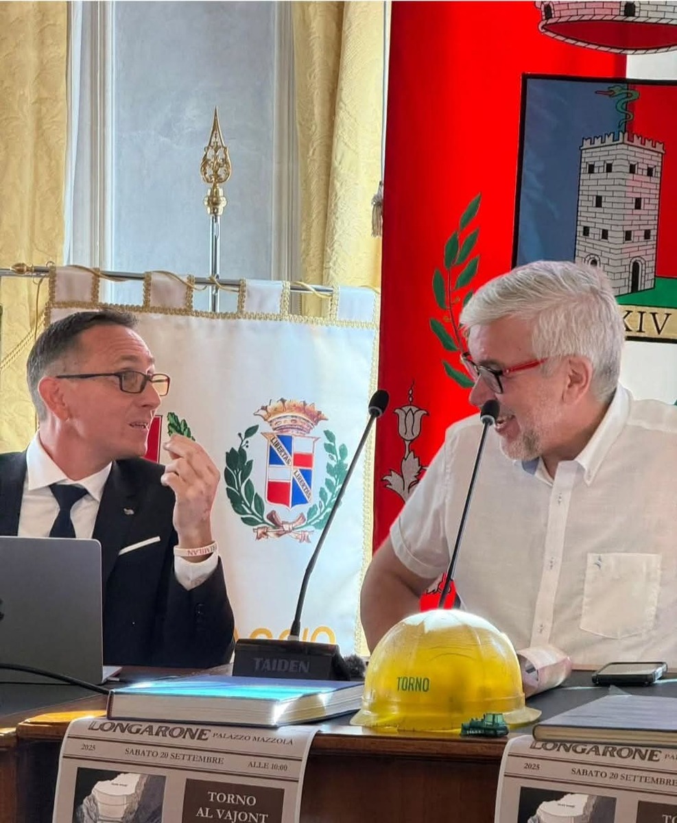 Con Davide abbiamo visto negli anni passare a Palazzo Mazzolà e in altri locali di paesi limitrofi molti personaggi di spicco a parlare di Vajont, e forse un po’ li abbiamo sempre invidiati, (impossibile arrivare a qual livello ci dicevamo qualche anno fa…) forse pensando di non poter mai arrivare neanche in un sogno a parlare di questa parte di storia italiana a Longarone. Poi, sia il sottoscritto che Davide, nel mio caso una parte piu tecnica riferita alla diga e alla sua costruzione, all’impresa Torno S.p.A. di Milano poco o mai citata ma parte fondamentale nella realizzazione dell’impianto, lui oltre alla diga tutto quello che ha intorno, studi, progetti e relative evoluzioni, fasi del processo penale postumo alla frana e non da poco conoscitore della parte umana, prima e dopo il disastro del 9 ottobre 1963, ci siamo completati, andando a fondere le nostre rispettive conoscenze, creando un’ amalgama arrivando a coronare il sogno (quasi proibito) di entrambi: parlare della diga del Vajont a Longarone, addirittura nella sala del Municipio.