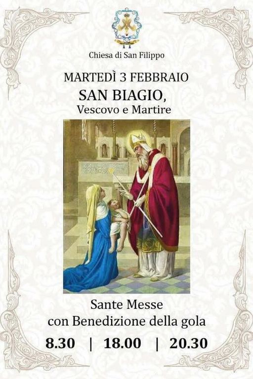 Martedì 3 febbraio ricorre invece la memoria di San Biagio, vescovo e martire, santo particolarmente venerato e invocato come protettore della gola. Durante la giornata si svolgeranno le Sante Messe con la tradizionale benedizione della gola alle ore 8.30, 18 e 20.30, offrendo ai fedeli un momento di preghiera e affidamento attraverso l’intercessione del santo.