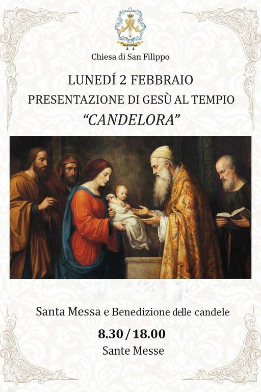 Lunedì 2 febbraio si celebra la Presentazione di Gesù al Tempio, la Candelora, festa che ricorda l’offerta del Bambino Gesù al Signore e Cristo come luce che illumina il cammino dell’umanità. In questa occasione, presso la Chiesa di San Filippo, saranno celebrate le Sante Messe con la benedizione delle candele alle ore 8.30 e 18.