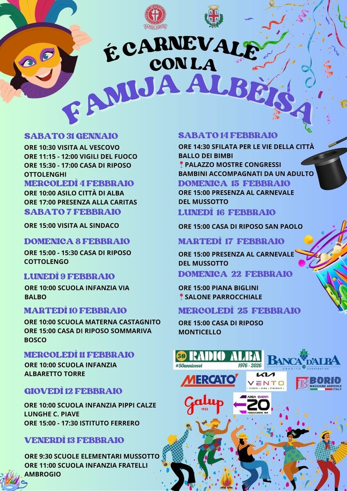 Il Carnevale albese 2026 si conferma così un appuntamento capace di unire tradizione, territorio e inclusione, rinnovando una festa che appartiene alla storia di Alba e che continua a parlare alle nuove generazioni.