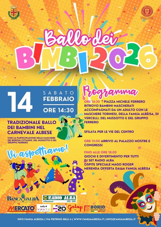 Il momento culminante del Carnevale albese 2026 sarà senza dubbio il Ballo dei Bambini, in programma sabato 14 febbraio a partire dalle ore 14.30. I piccoli partecipanti, rigorosamente mascherati e accompagnati da un adulto, sfileranno per le vie del centro cittadino fino a raggiungere il Palazzo Mostre e Congressi di Alba.