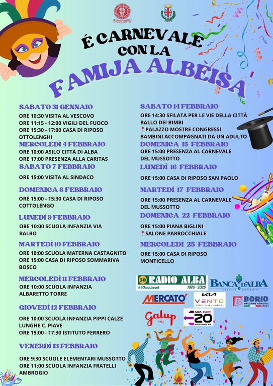 Ampio spazio sarà dedicato anche alle scuole dell’infanzia di Alba e del territorio, dove le maschere incontreranno i bambini per raccontare il significato del Carnevale, le sue origini e le tradizioni dei gruppi mascherati locali, in un percorso educativo che unisce gioco e memoria storica.