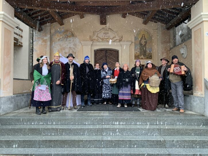 Una ventina di figuranti rievoca la storia popolare cantando in piemontese, accompagnati dal suono della fisarmonica.