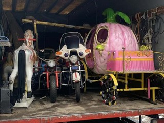 I cavalli, il mezzo dei pompieri, la moto. la carrozza delle principesse... tutti smontati e caricati su un camion per essere portati via.