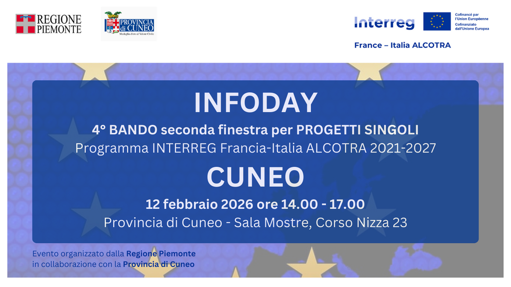 Giovedì 12 febbraio, dalle ore 14 al le ore 17, la Sala Mostre della Provincia di Cuneo (Corso Nizza 23 – angolo corso Dante) ospiterà l’Infoday di presentazione della seconda finestra del 4° bando per Progetti singoli del Programma di cooperazione transfrontaliera Francia- Italia Alcotra.