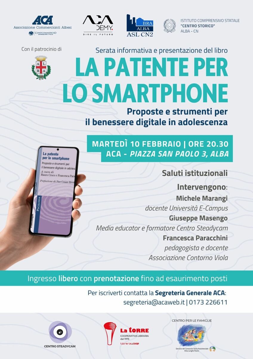 Il progetto del Patentino, avviato da anni sul territorio, mira a promuovere un approccio formativo e consapevole all’uso dello smartphone tra i più giovani, coinvolgendo scuole, famiglie e operatori della salute. L’evento è realizzato in collaborazione con ACA e Academy, l’Istituto Comprensivo Centro Storico di Alba, la Cooperativa libraria La Torre, il Centro Famiglie del Consorzio Socio Assistenziale Alba-Langhe-Roero, e con il patrocinio della Città di Alba.